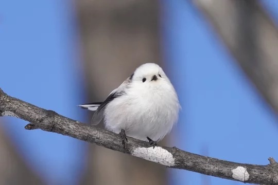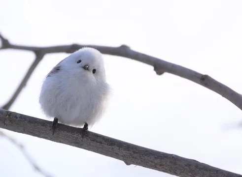 冬のシマエナガは、寒さから身を守るために羽毛をふくらませ、丸くて白い姿になります。この姿が「雪の妖精」と呼ばれる理由であり、写真や動画で多くの人を魅了しています。羽毛をふくらませることで、羽毛の間に空気の層を作り、断熱効果を高めています。これにより、体温の放散を最小限に抑えることができます。