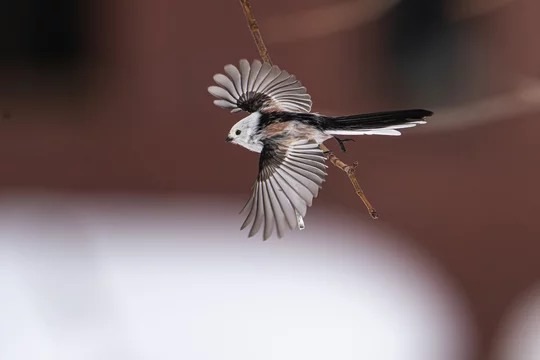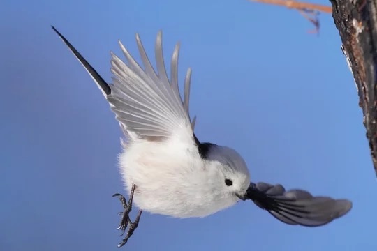 シマエナガの長い尾は、単なる装飾ではありません。この尾は飛行時のバランス調整に不可欠で、特に急な方向転換や細い枝での移動時に舵の役割を果たします。また、木の幹に垂直にとまる際には、尾を支えとして使うこともあります。